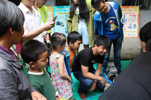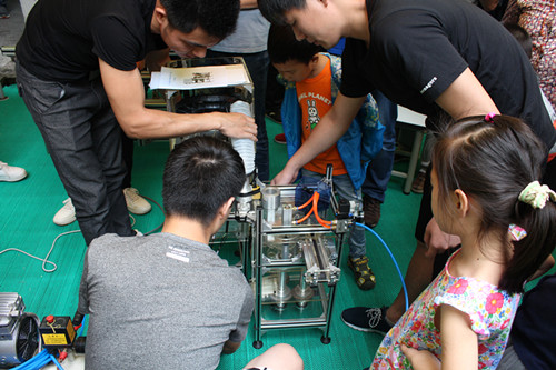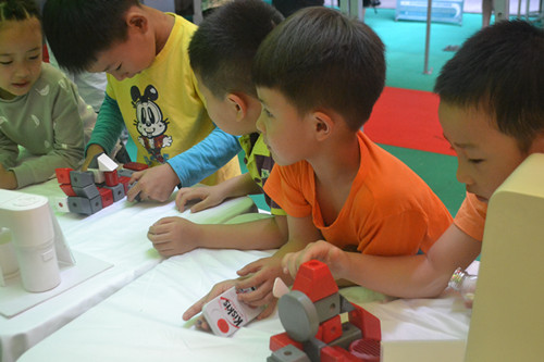 只听阵阵欢呼声从“足球机器人”展区传来,“太棒了!又进啦!”。面对几个身手敏捷的迷你“运动员”在模拟绿茵场上的精彩表现,小朋友们欢呼雀跃,十分激动。兴奋的同时,他们也在发挥自己的想象力,思考这几个模样憨厚可爱的小人是怎么跑起来的,“肯定有一个隐形的推动器”,“它肯定是通过什么感应器才能知道球在哪吧?”,“为什么能踢得那么准呢?”小朋友们互相嘀咕着。