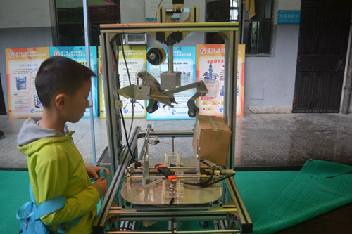 除了迷你“运动员”,“探险员”还有各色各式的“搬运工”、“包装工”、“钱币分拣机”等,精彩不断。生活中的繁琐事情在科技创新类机械设计作品中都已不是问题。一台能够实现纸箱快速定位,十字封箱,还可以适应包装盒大小进行自动调整的包装机,赢得了观战者的啧啧称赞。