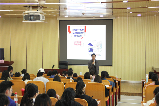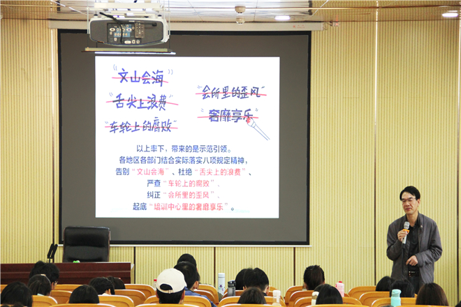陈老师以“八项规定”为立足点,结合案例深入浅出地讲述党中央以上率下,为人民带来引领与示范。他提醒在座学员要警惕隐藏在形式主义、官僚主义、享乐主义、奢靡之风“四风”中脱离群众的巨大危险,并通过近年防腐败行动力度大、不封顶、全覆盖、成效明显的现象,清晰回答了“为什么作风改变中国”这一问题。