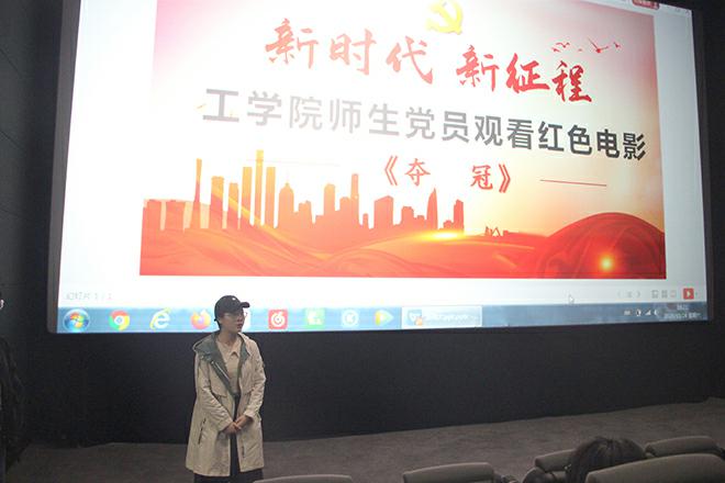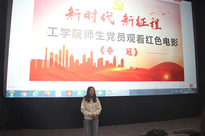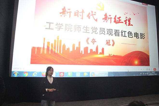 机械系学生党支部许艳亭同志于最后发言,她讲道:影片的主角郎平教练作为时代的楷模,可以说是女排精神的集中体现,我们要学习她身上那种敢于拼搏,将每件事都做到极致的可贵品质,真正做到“祖国至上,团结协作,顽强拼搏,永不言败”。