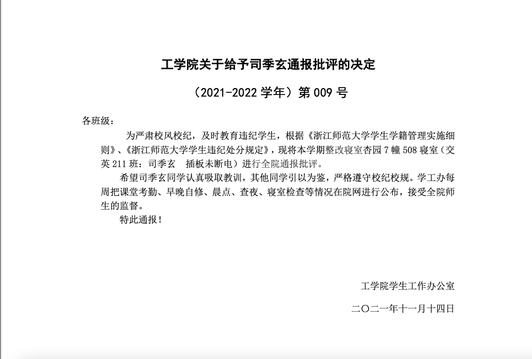 工学院通报批评(2021-2022学年)第009号