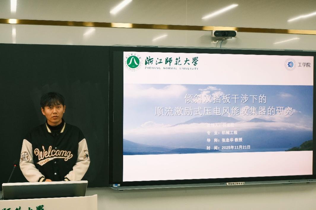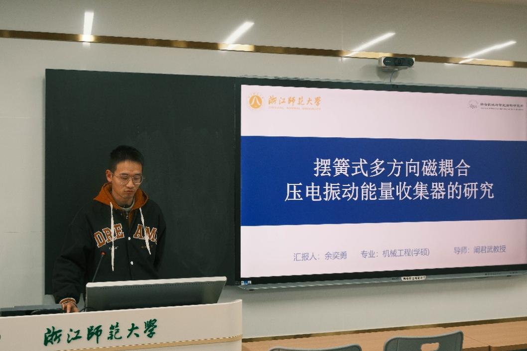 余奕勇同学秉持可持续发展理念,为缓解能源压力,汇报了自己对摆簧式多方向磁耦合压电振动能量收集器的研究,阐述了该仪器的结构和工作原理,并用仿真软件进行了测试,发现工作参数与仪器结构均会对仪器的性能产生影响,为验证数据正确性,余奕勇同学制作了试验样机,搭建测试系统,并取得了一定的成果。