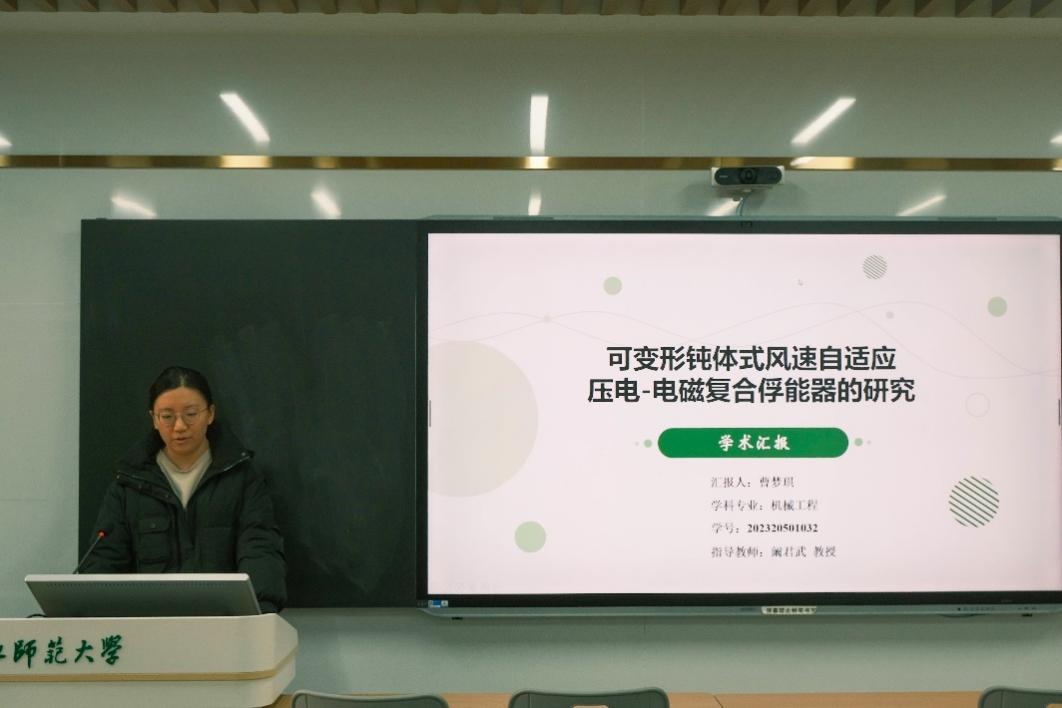 曹梦琪同学介绍了现有的多种俘能器及其优缺点,引出了自己对可变形钝体式风速自适应压电-电磁复合俘能器的研究,她利用大量的图表和数据,生动形象地介绍了其结构以及工作原理。