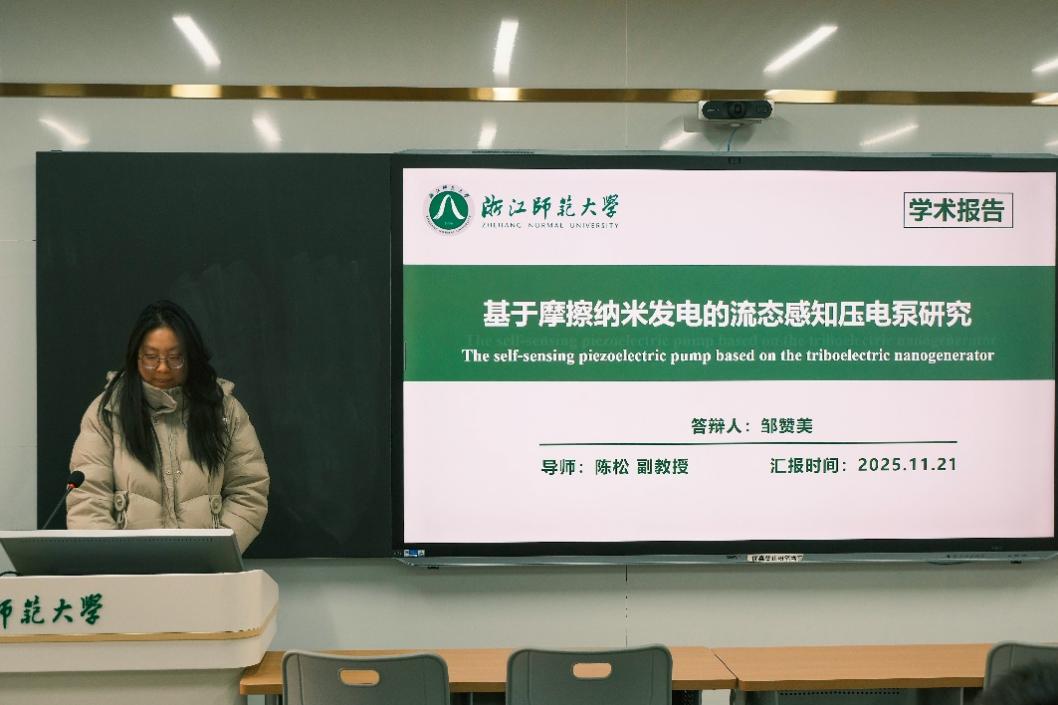 邹赞美同学,以“基于摩擦纳米发电的流态感知压电泵研究为题”,将压电泵结构紧凑、能量密度高以及高频响应等优势与摩擦电传感器结合起来,提出了一种添加摩擦材料的自感知压电泵,并结合图表和数据讲述了工作原理,汇报了测试成果。