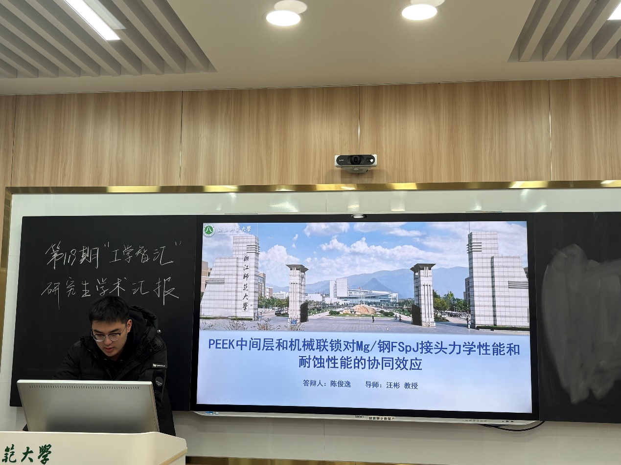 陈俊逸同学汇报的主题是《PEEK中间层和机械联锁对Mg/钢FSpJ接头力学性能和耐蚀性能的协同效应》, 聚焦镁钢连接接头的性能优化问题,探究批注建设与机械连锁对连接性能的影响机制。研究发现,该技术可有效抑制接头处金属间化合物的形成,通过优化工艺参数,搭配PEEK层设计,显著提升了接头的耐腐蚀性能,为镁钢连接技术的工程应用提供了技术参考。