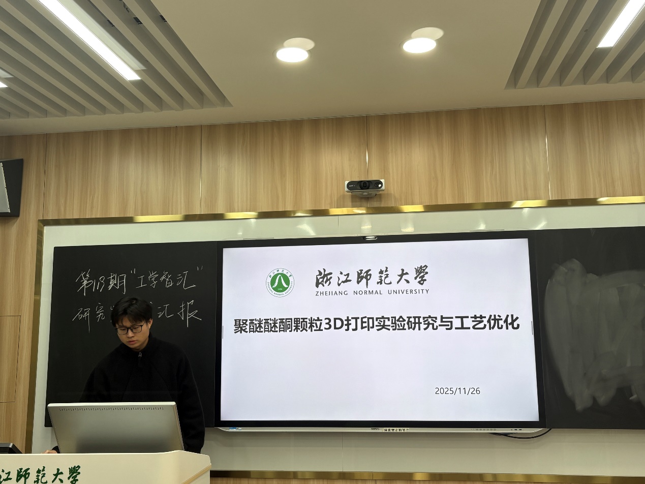 吴程欢同学汇报的主题是《聚醚醚酮颗粒3D打印实验研究与工艺优化》,采用熔融颗粒制造技术,开展聚醚酮颗粒的3D打印实验研究。通过自主搭建实验设备,系统探究工艺参数对打印件结晶度、力学性能等关键指标的影响规律,为聚醚酮材料的3D打印工艺优化提供了实验基础。