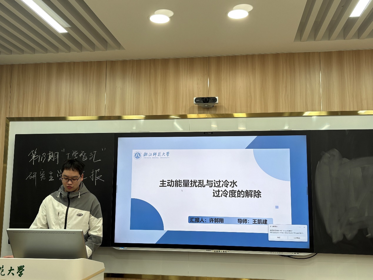 许郭翔同学汇报的主题是《主动能量扰乱与过冷水过冷度的解除》,围绕过冷水过冷度解除展开研究,结合能源需求等实际背景,阐述了研究对保障相关系统稳定运行的重要意义。通过搭建专项实验系统,系统探究不同过冷度条件下过冷状态的解除规律,为过冷水相关技术的工程应用提供了实验依据。