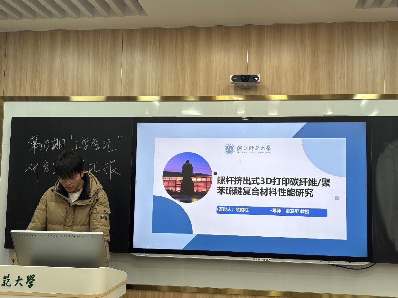 余昭柱同学汇报的主题是《螺杆挤出式3D打印碳纤维/聚苯硫醚复合材料性能研究》,立足轻量化材料的应用需求,开展3D打印碳纤维复合材料性能研究,采用双螺杆挤出等工艺制备复合材料试样,重点分析其拉伸性能等关键力学指标,为碳纤维复合材料在3D打印领域的优化应用提供了数据支撑。