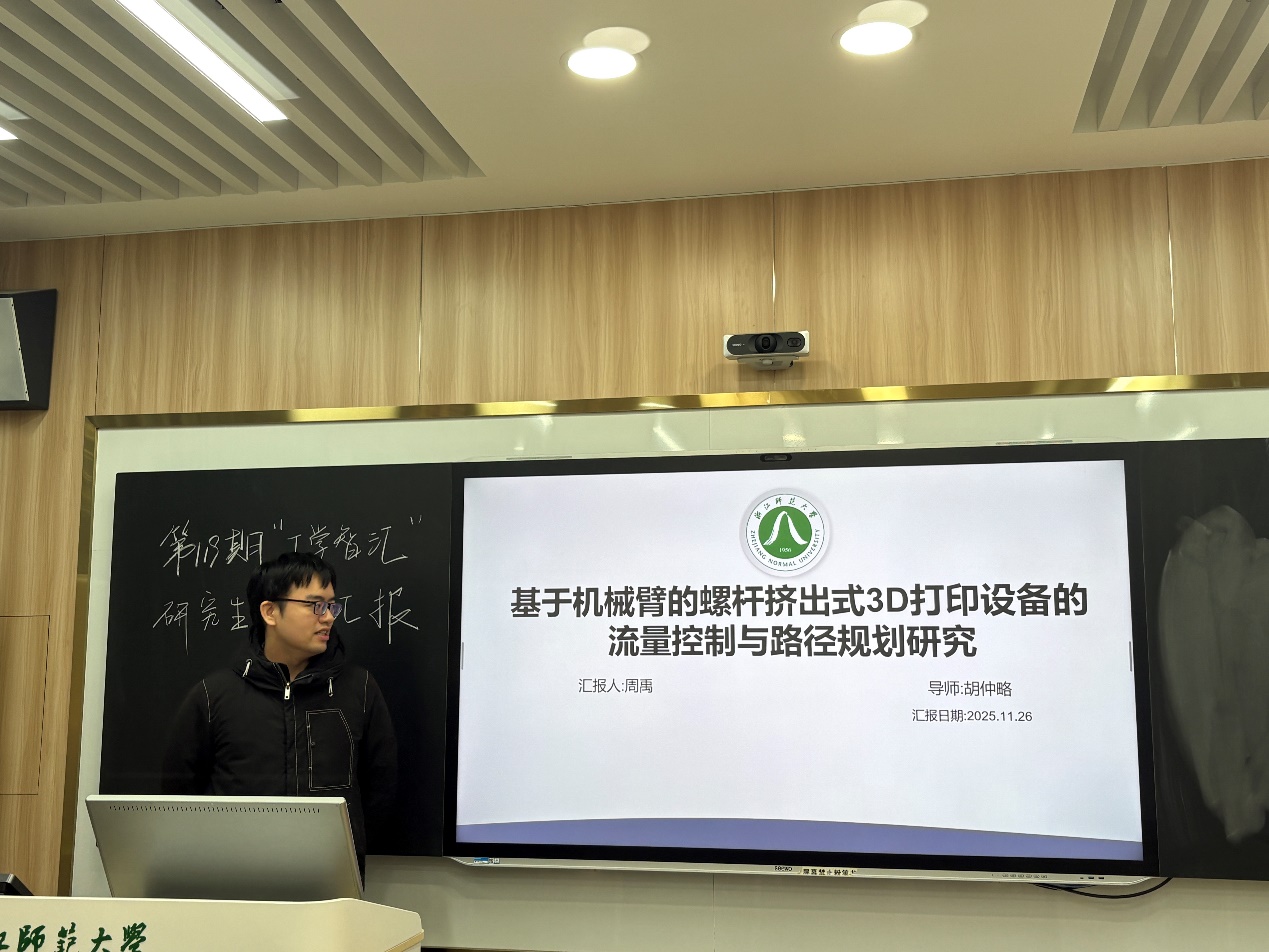 周禹同学汇报的主题是《基于机械臂的螺杆挤出式3D打印设备的流量控制与路径规划研究》,针对现有3D打印技术的不足,以机械臂为载体,聚焦流量控制与路径规划两大核心问题。通过自主搭建设备、开发专用算法并完成实验验证,实现了3D打印过程中通讯建立等关键技术创新,为提升3D打印精度与效率提供了新方案。