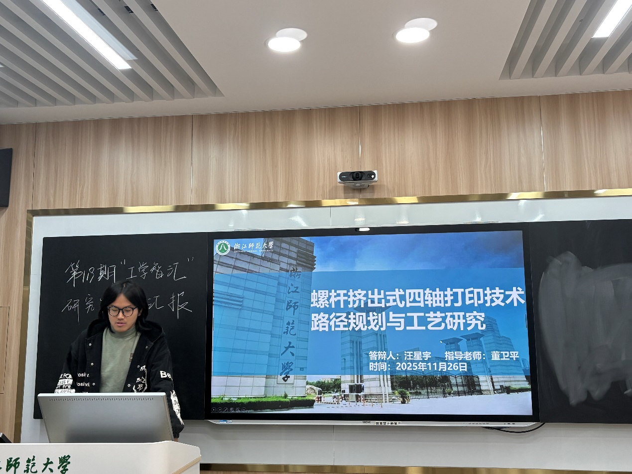 汪星宇同学汇报的主题是《螺杆挤出式四轴打印技术路径规划与工艺研究》, 围绕3D打印曲面加工的技术痛点,开展四大核心技术的组织与实施研究。通过算法理论论证与实践验证,简化了曲面打印的操作流程,降低了技术入门门槛,为3D打印曲面加工的普及与推广提供了便利。