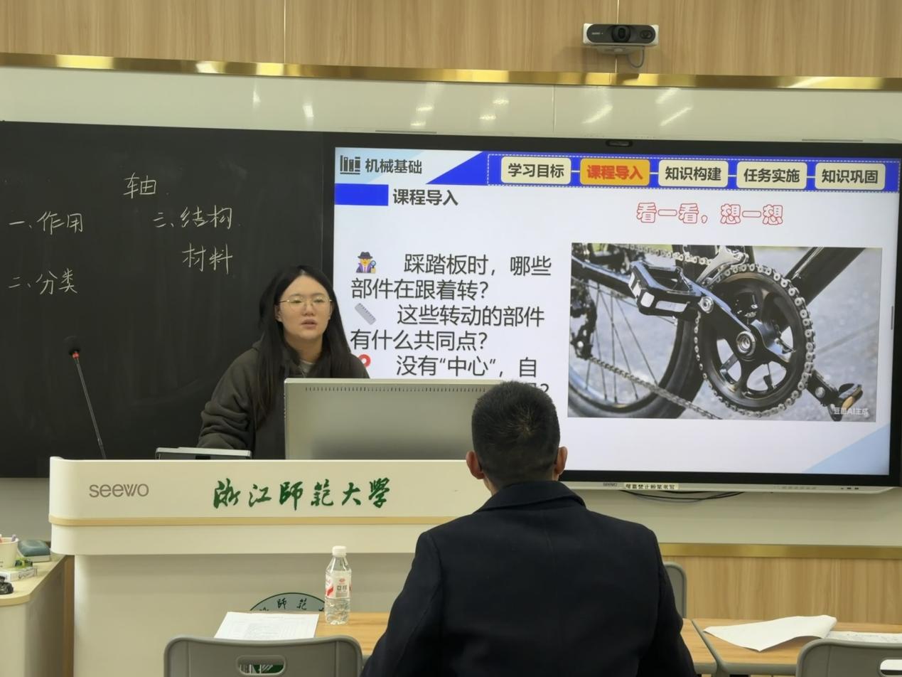 丰子童同学以“走进‘轴’的世界”为试讲主题,课前通过自行车转动图导入课程,引导学生讨论互动,自然引出教学核心。本堂课核心任务是让学生掌握轴的作用、分类、常用材料及结构组成。她围绕核心内容展开教学,讲解条理清晰。首先剖析轴的三大作用,再按“轴线形状→直轴外形→承载情况”的逻辑层层递进讲解轴的分类,结合自行车轴、汽车传动轴等实例帮助理解,然后详细阐述碳钢、合金钢、球墨铸铁三类常用材料的特性与适用场景,还结合阶梯轴示意图解读轴的结构组成及设计要求。为巩固所学,她准备了针对性课堂练习题,通过个别抽查等形式检验学习效果,课程最后结合中国制造业高质量发展背景升华工匠精神。整个教学过程互动性强,充分体现了职业教育的实践导向。