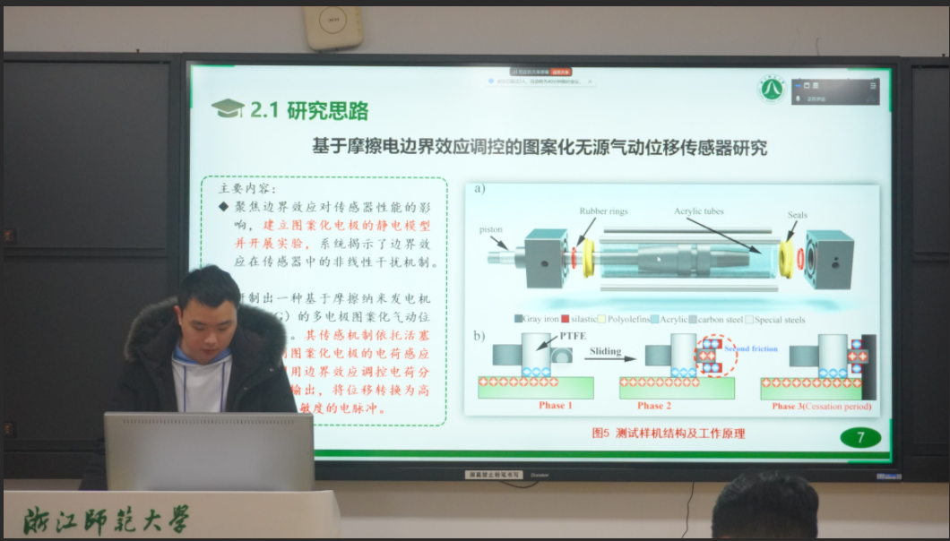 苏腾宏同学分享了他基于摩擦电边界效应调控的图案化无源气动位移传感器研究,他瞄准了工业自动化中机械状态感知的痛点,深入探究了摩擦纳米发电机中的“边界效应”,并利用图案化电极设计对其进行精确调控。以此为基础,他成功研制出一种无源气动位移传感器,该传感器能将气缸活塞的直线位移直接转换为线性度高、灵敏度好的电信号。这种传感器具有自供能、柔性化、抗干扰能力强等优点,为复杂机械系统内部的状态监测提供了可靠且低成本的新工具。