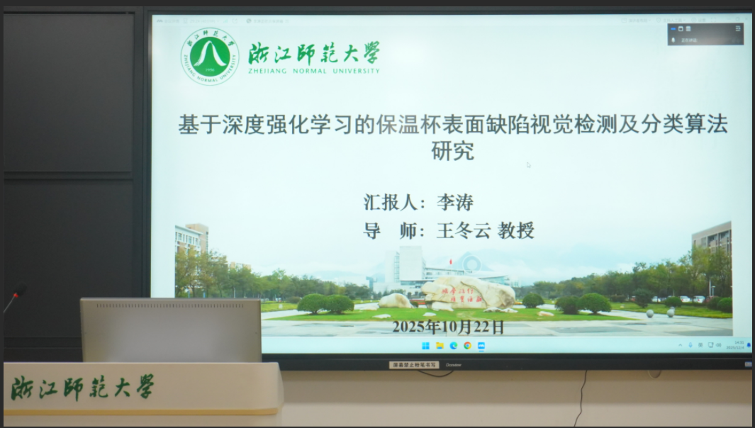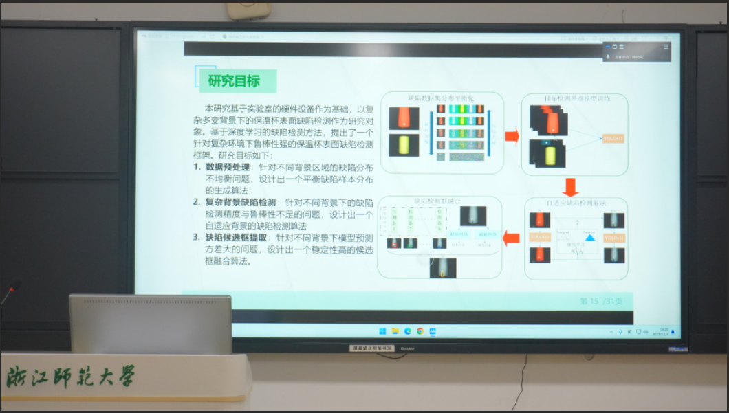 李涛同学的研究课题是“基于深度强化学习的保温杯表面缺陷检测及分类算法研究”,旨在实现保温杯表面缺陷检测的智能化升级。他主导开发了一套集自动化图像采集、智能算法分析与分类于一体的检测系统。针对实际生产中的数据不平衡问题,他采用了自适应深度强化学习策略进行数据增强;并设计了多尺度缺陷检测与分类模型。最终,该系统成功部署于企业生产线,实现了对多种缺陷的快速、准确识别,有效替代了传统低效的人工目检。