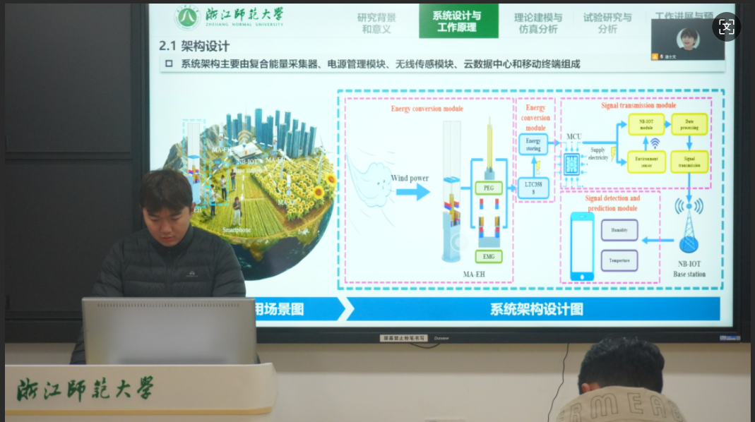 凌铭同学的汇报主题是“一种基于压电-电磁复合能量采集器的自供能NB-IoT远程监测系统”,他致力于解决物联网监测设备的供电难题,并由此设计了一种复合能量采集器,巧妙结合压电与电磁原理,能高效捕获环境中的机械振动或压力并转化为电能。以此为核心,他构建了完整的自供能远程监测系统,集成高效的电源管理与NB-IoT通讯模块,实现了数据从采集、无线传输至云平台与终端用户的完整闭环,为野外或不易布线场景的长期监测提供了创新方案。
