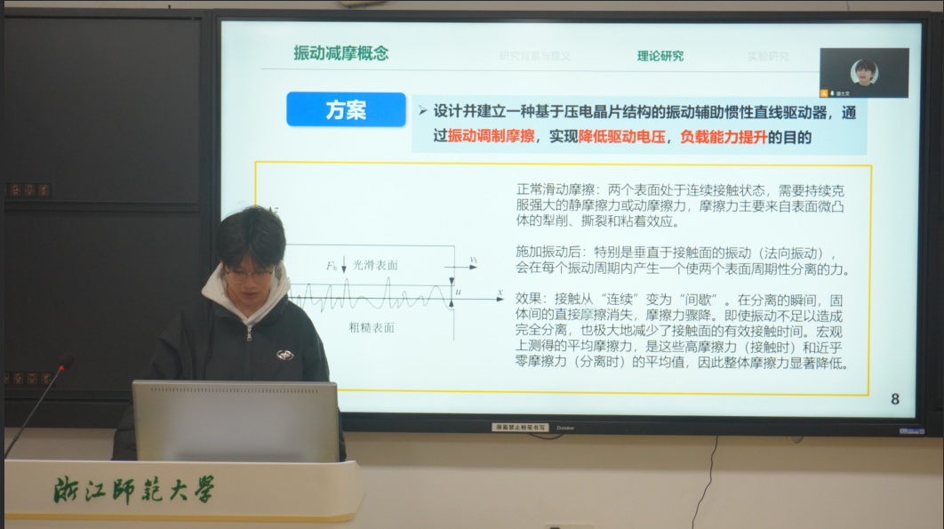赵信杰同学则分享了关于振动辅助式压电惯性驱动器的研究,他旨在提升压电惯性驱动器的综合性能,创新性地引入了振动辅助机制,通过在驱动足处施加特定频率的微振动,动态调节其与运动轨道间的摩擦状态。这一设计有效降低了驱动器的启动电压,并显著提升了其负载能力和运动速度。通过理论建模与实验验证,他优化了振动参数,使驱动器在保持结构紧凑优势的同时,输出性能获得了突破性提升,拓展了其在精密定位领域的应用潜力。