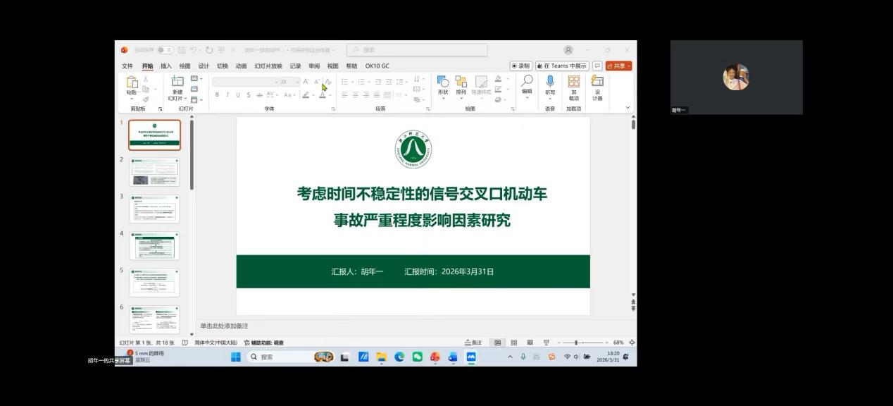 胡年一同学围绕《考虑时间不稳定性的信号交叉口机动车事故严重程度影响因素研究》展开汇报,针对传统模型忽视时间动态性的不足,构建了统计与机器学习混合模型。她通过构建随机参数Logit与均值异质性随机参数Logit模型并对比,确定均值异质性模型拟合效果最优;经检验识别出部分因素具有时间稳定性,部分则存在时间不稳定性。研究进一步构建部分时间约束模型,区分出可约束与不可约束因素,提升了解释力,同时结合CatBoost模型与SHAP方法,验证了因素影响方向与统计模型一致,并精准捕捉到平峰与高峰时段在道路隔离、交叉口类型及车辆类型上的交互效应差异。
