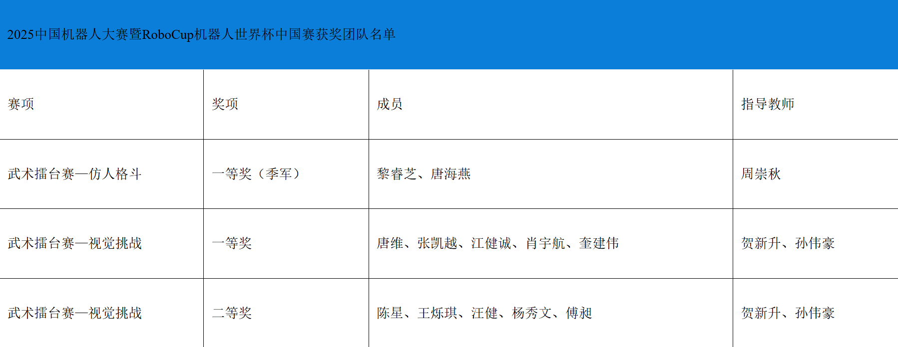 From October 17 to 19, our students achieved outstanding results at the 2025 China Robot Competition & RoboCup China Open, winning two national first prizes and one national second prize. Among these, they secured the national third place in the "Martial Arts Arena—Humanoid Combat Event." The participants demonstrated strong engineering competence, innovative practical skills, and teamwork, reflecting the effectiveness of our institute's efforts in robotics technology innovation, industry-education integration, and talent cultivation. The competition brought together over 1,700 teams from more than 300 universities across China, with over 5,000 participants.